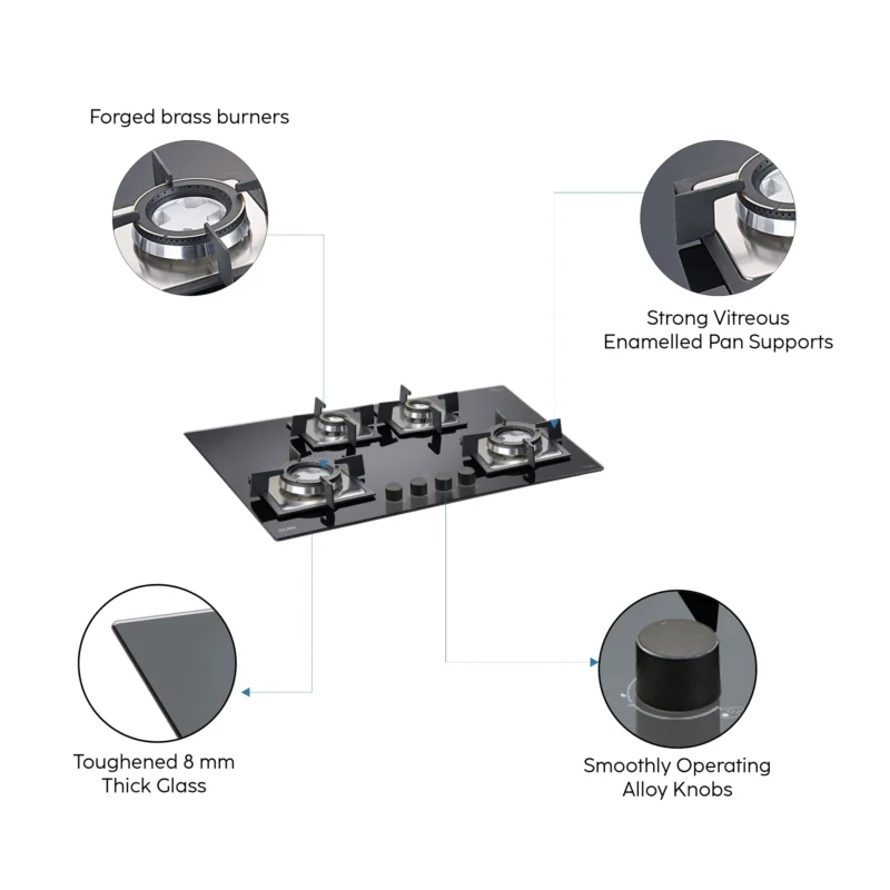 4 Burner Built-in Glass Hob with Forged Brass Double Ring Burner Auto Ignition (1074 SQ DB)