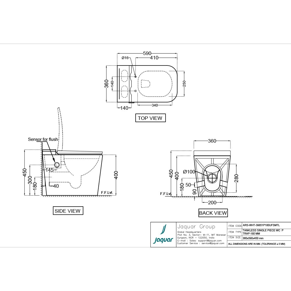 The Jaquar Tankless Single Piece WC – Model ARS-WHT-39851P180UFSMTL is a technologically advanced and space-efficient sanitary fixture designed for modern bathrooms. Built from premium vitreous china, it offers superior durability, a smooth finish, and long-lasting performance.